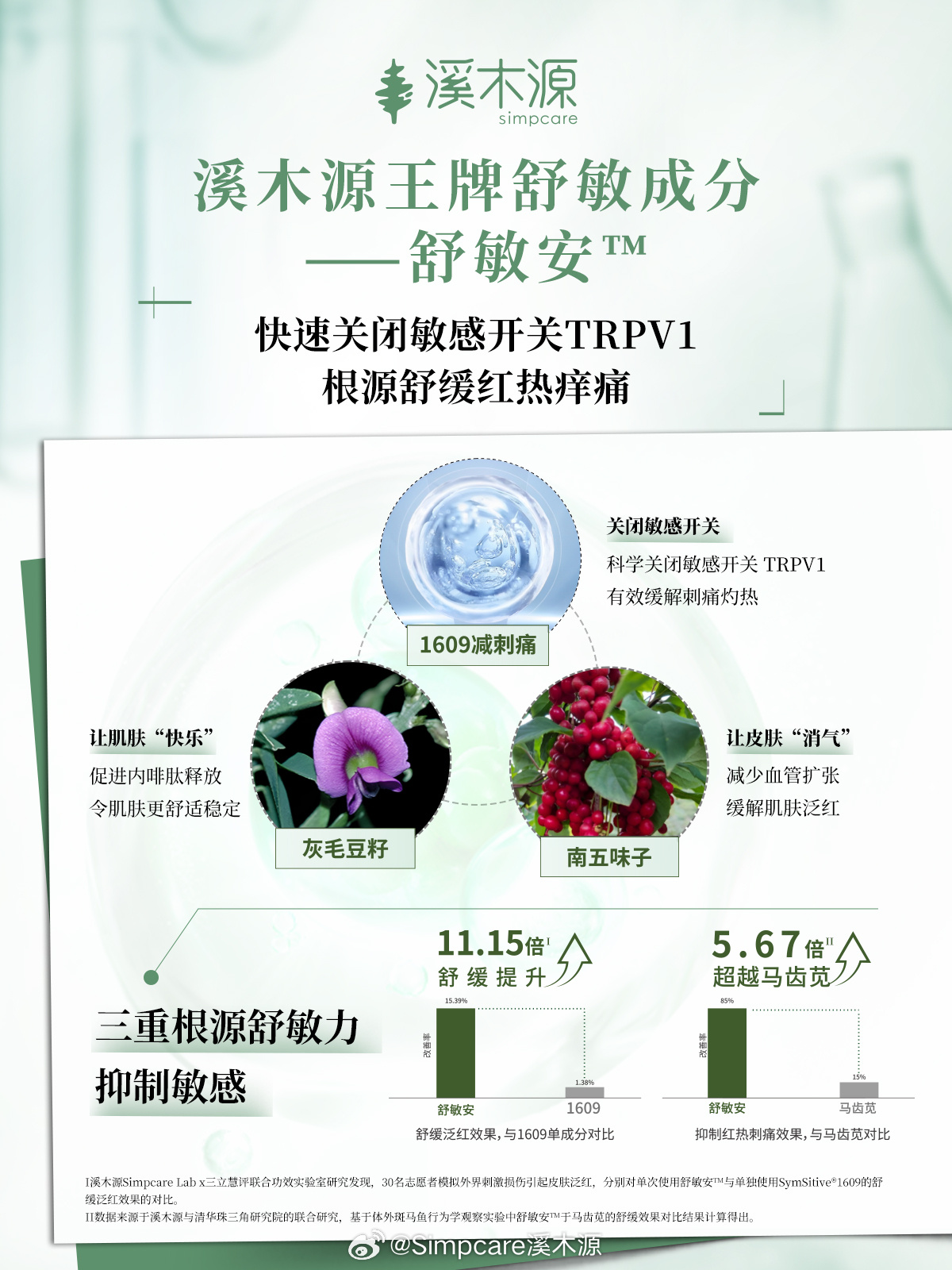 溪木源坚持以科研驱动发展,深耕自然成分的研发与转化。品牌自研专利成分“舒敏安™”,将南五味子、灰毛豆籽与经典舒敏成分1609精准配比,解决敏感肌红、热、痒、痛四大痛点;为突破敏感肌美白难题,从意大利阿尔卑斯山白桑根中提取氧化白藜芦醇,作为自研专利成分“氧白因™”的核心组分,实现美白与修护的双重功效。其研究并不止步于功效。在第34届IFSCC大会上,溪木源展示了针对敏感肌的珊瑚友好型防晒研究成果。这证明了其科研视野已从肌肤健康延伸至生态保护,注重产品与环境之间的和谐共生。
